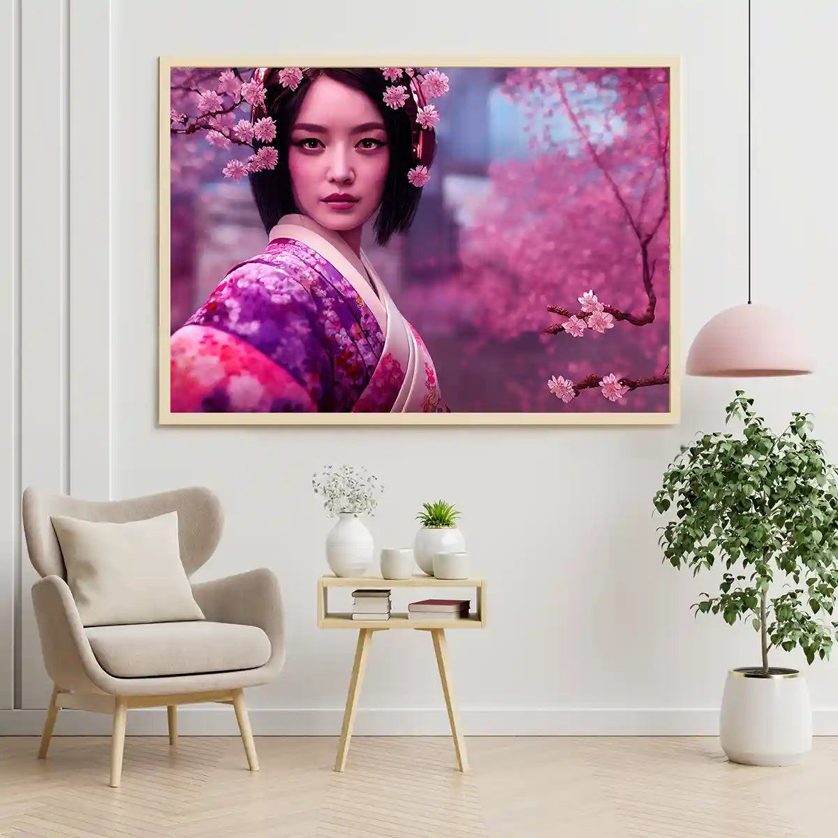 Japanese Geisha in Traditional Kimono with Cherry Blossom Garden Background