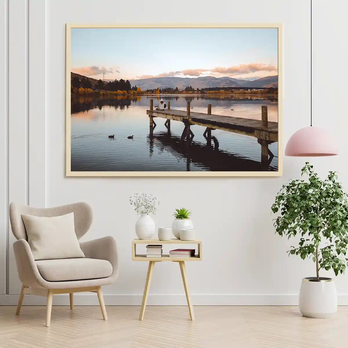 Lake Pier with Ducks and Woman Sitting with Guitar in Cromwell New Zealand